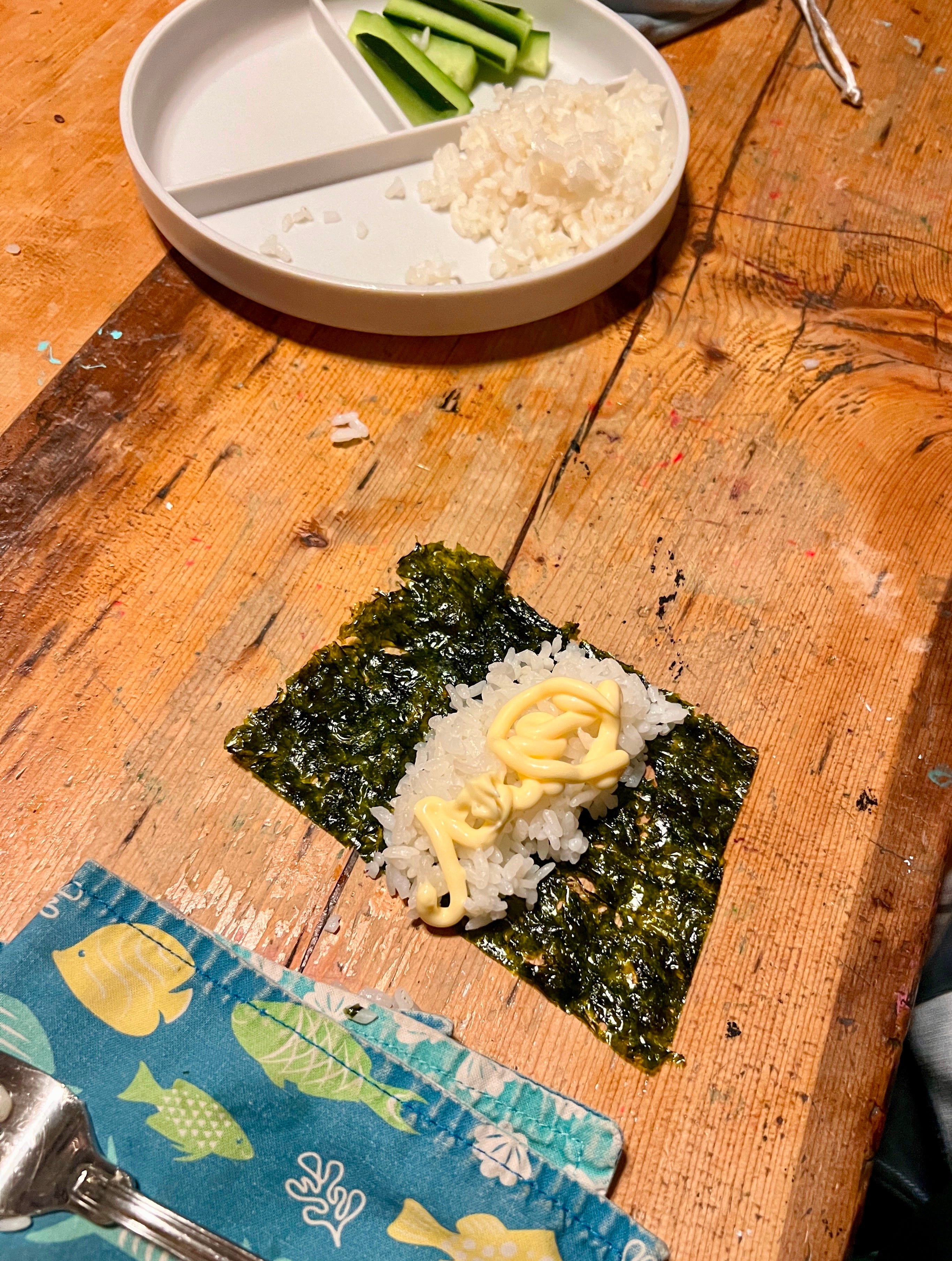 Our most consumed dinner is “rice.” I ride hard for my cheap and cheerful Aroma rice cooker, we use it multiple times a week. Julian, seven, the extremely picky one, won’t eat vegetables. But he will eat seaweed. And he will put sushi rice inside seaweed with a whopping amount of Kewpie and make a roll. Sometimes he will put cucumbers in there too! But the key is the rice base we can adjust for ourselves. Paloma, five (and a half, she insists), is less picky, and likes her “special rice,” with soy sauce, Kewpie, and furikake. She and I usually have roasted miso salmon and cucumbers soaked in a little rice vinegar/sugar/salt, and steamed broccolini or roasted cabbage.